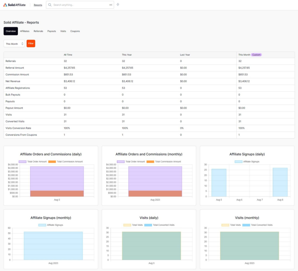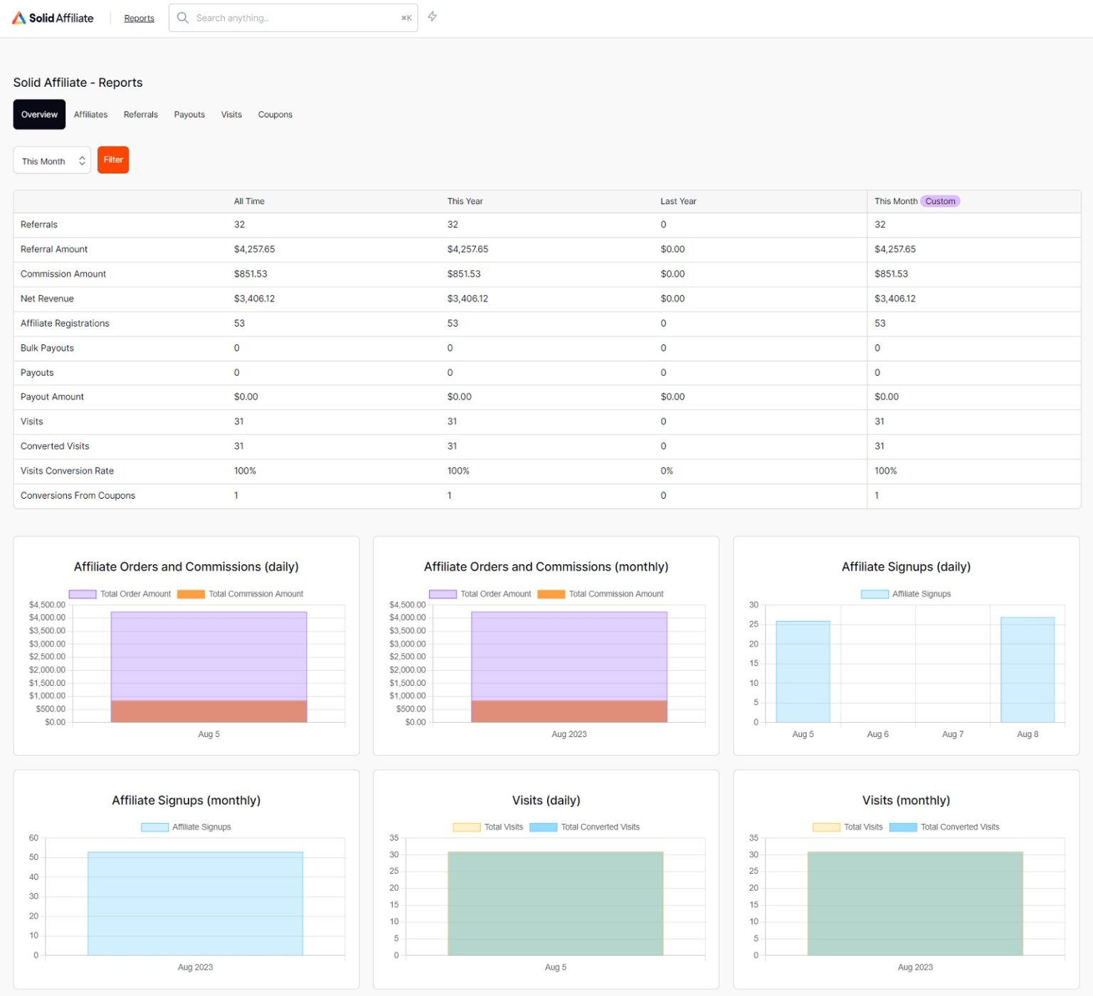 Of course, you would. Affiliates want to see their scorecard just like every other salesperson on the planet. And not just a scorecard. They want a dashboard or portal that puts all their information at their fingertips, as Solid Affiliate does here: