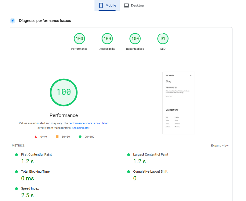 | PageSpeed Mobile Score | 91/100 | 88/100 | Green for Divi. |