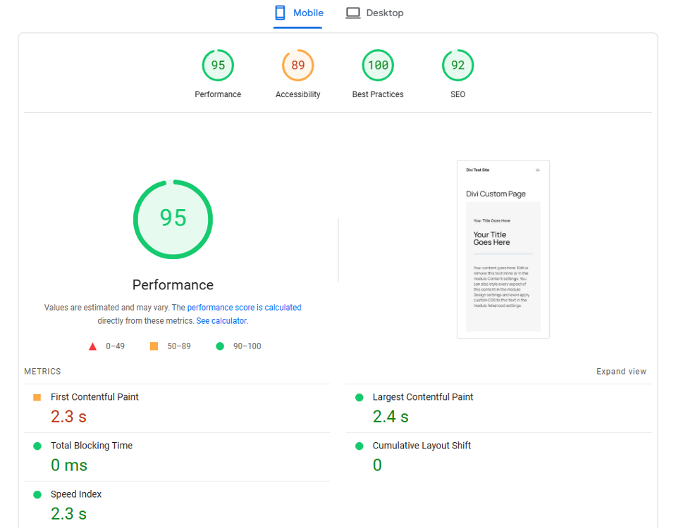 Here are the Google PageSpeed Insights results for the page built with Divi: