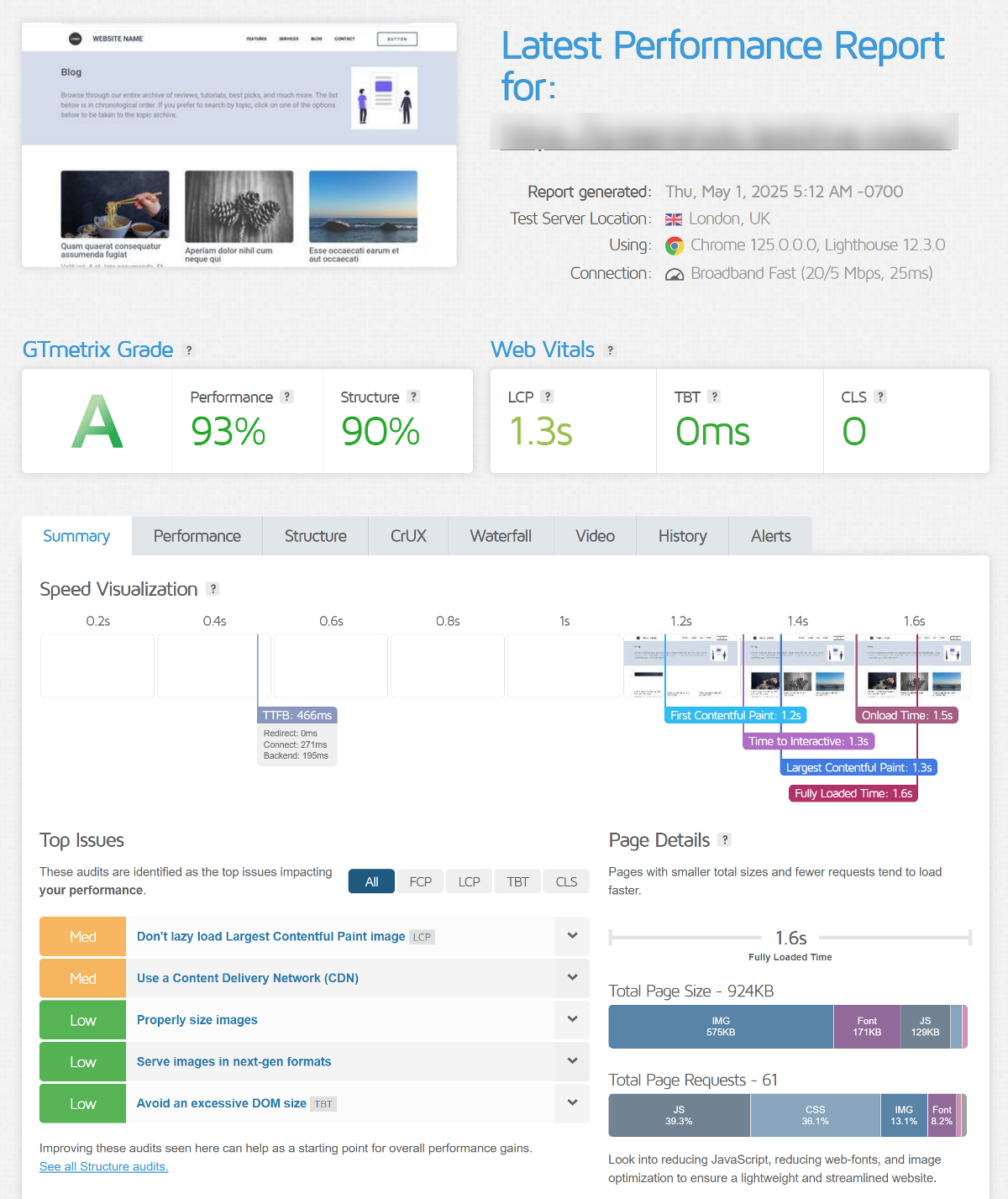 For consistency, we ran the GTmetrix tests from London, UK, using a Chrome browser on a Broadband connection (20/5 Mbps).