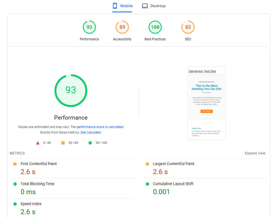 For the simple page built with Elementor, here are the test results from Google PageSpeed Insights: