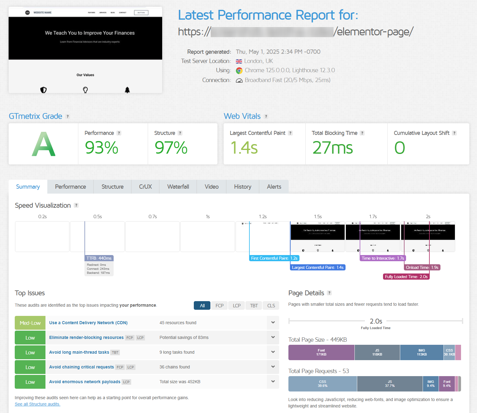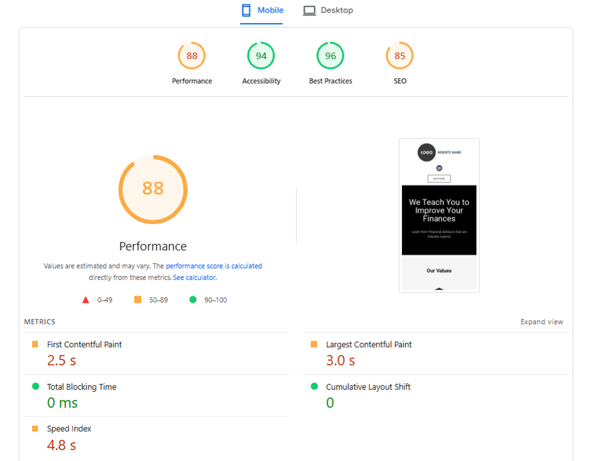 For the moderate page built with Elementor, here are the test results from Google PageSpeed Insights: