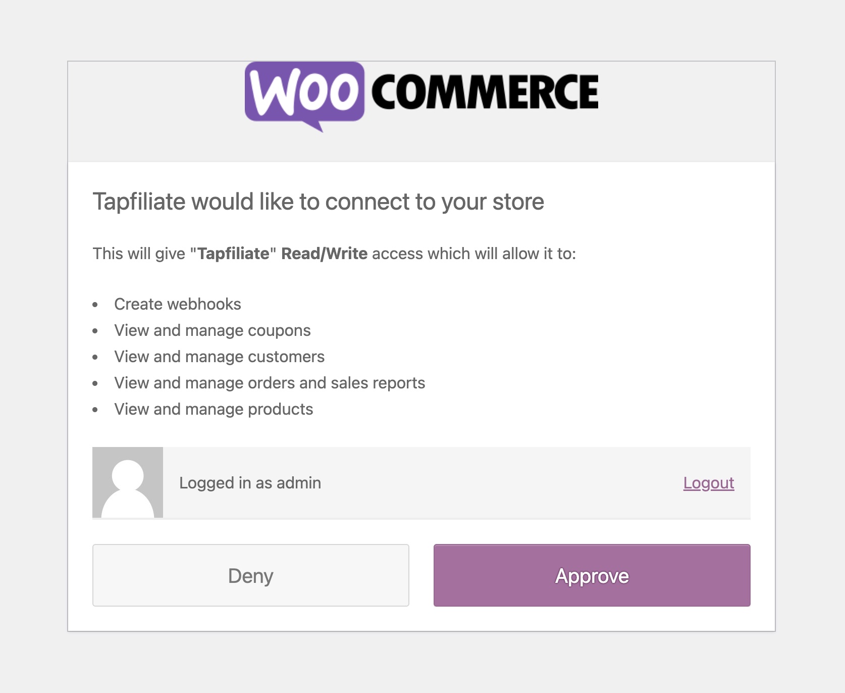 Once you've clicked the Approve button, you'll see the message: WooCommerce was successfully connected with Tapfiliate.