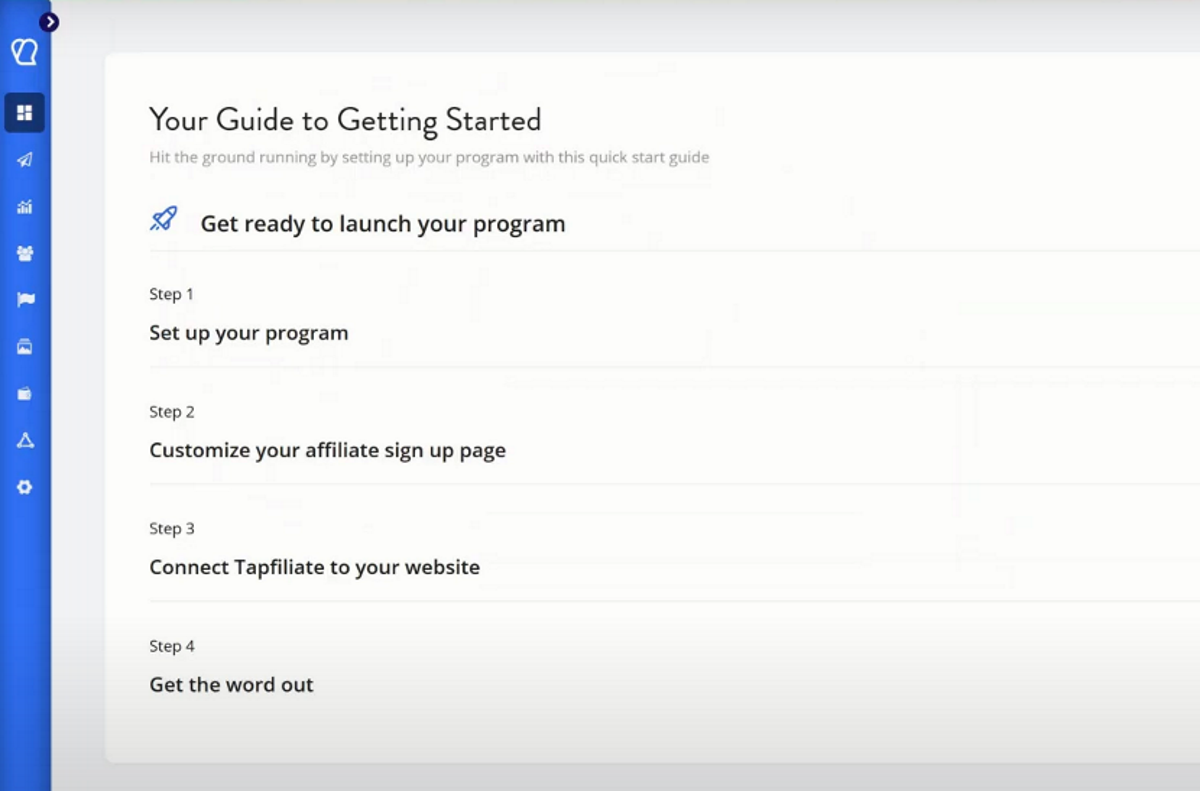 The process starts by creating an account on the Tapfiliate website, where a Getting Started guide walks you through the initial steps.