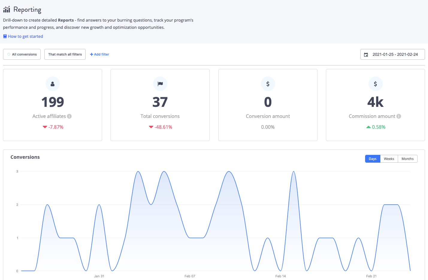 Tapfiliate provides a reporting dashboard that gives you an overview of your program's health, with key metrics like total affiliates, total conversions, and commission amount available at a glance.