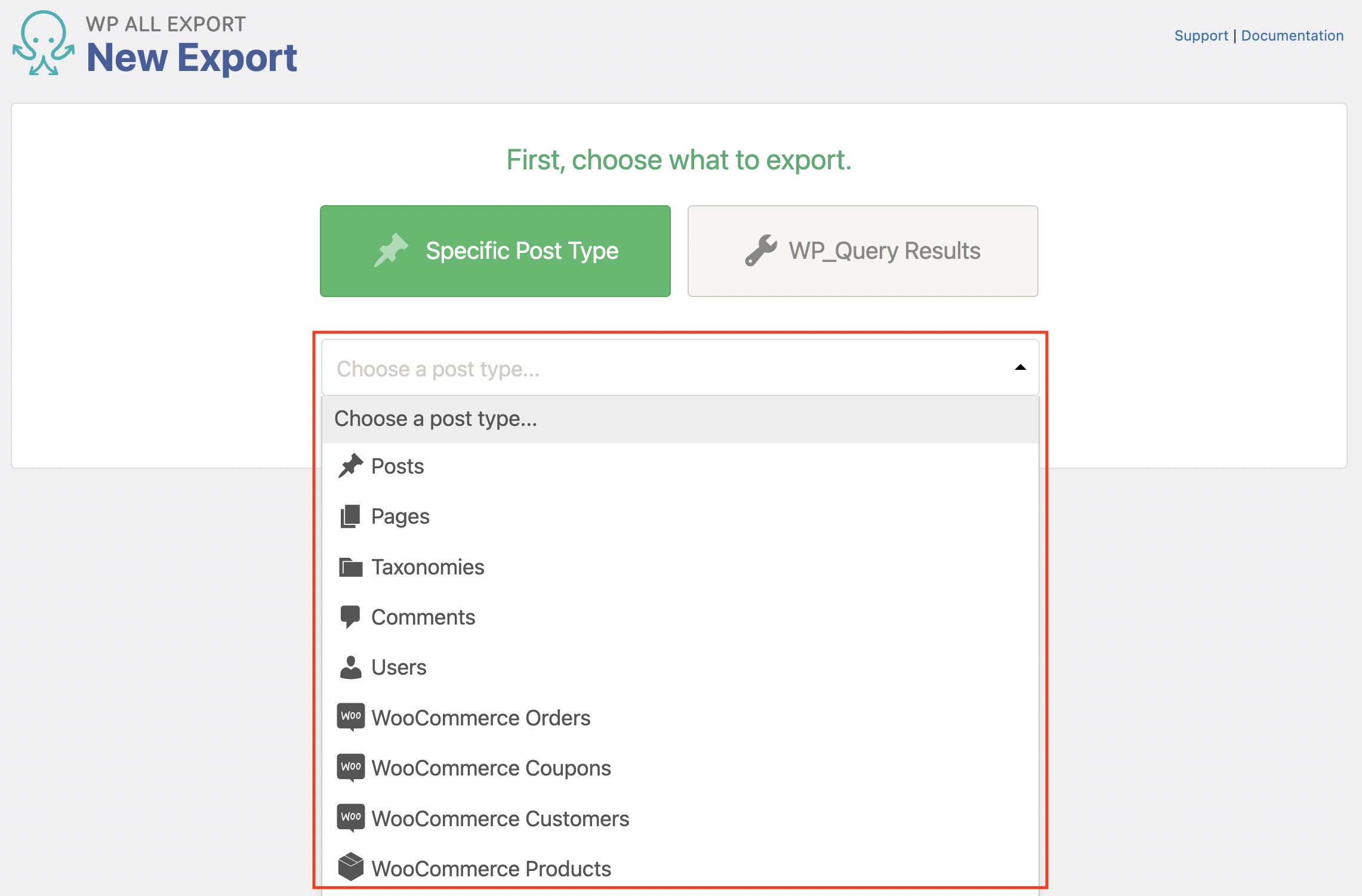 WordPress separates data into different post types like posts, pages, WooCommerce products, real estate properties, etc. You can export any custom post type or taxonomy by selecting it here.