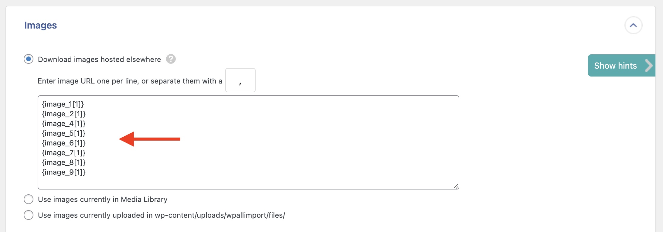 Simply drag & drop the column or element containing your image URLs or filenames to the appropriate textbox, and change the Separator character if it is different than a comma.