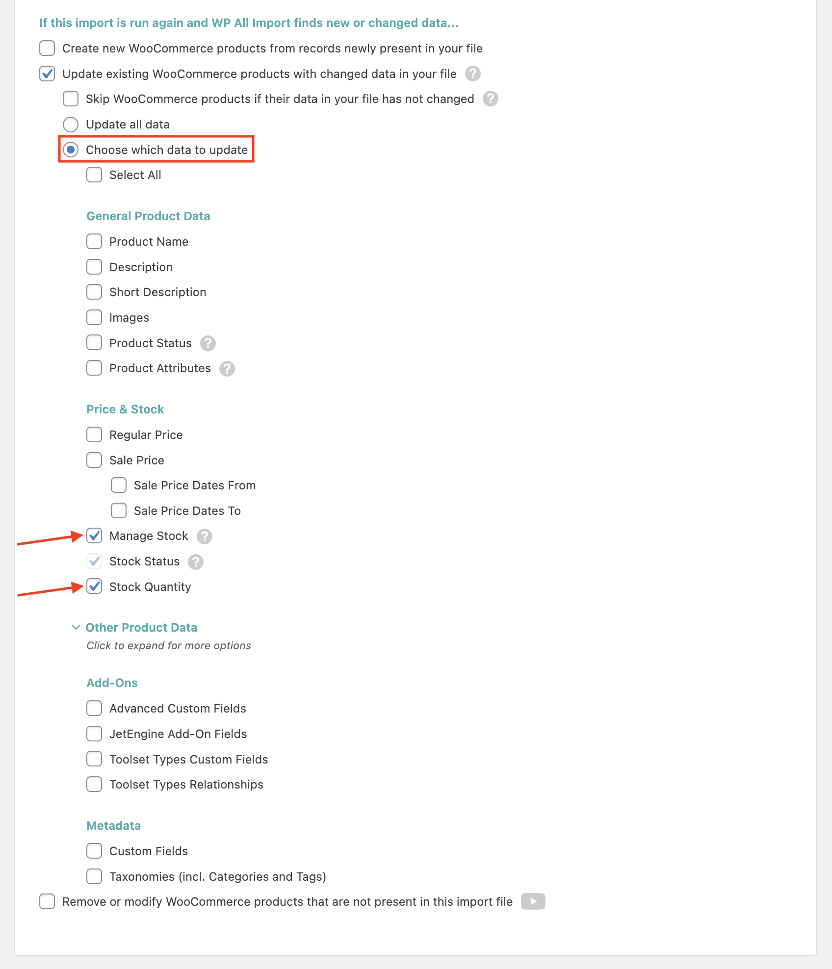 Now we need to tell WP All Import to only update our product stock levels. WooCommerce stores these stock levels in custom fields called _stock and _manage_stock. But we have options for you to select these fields directly.