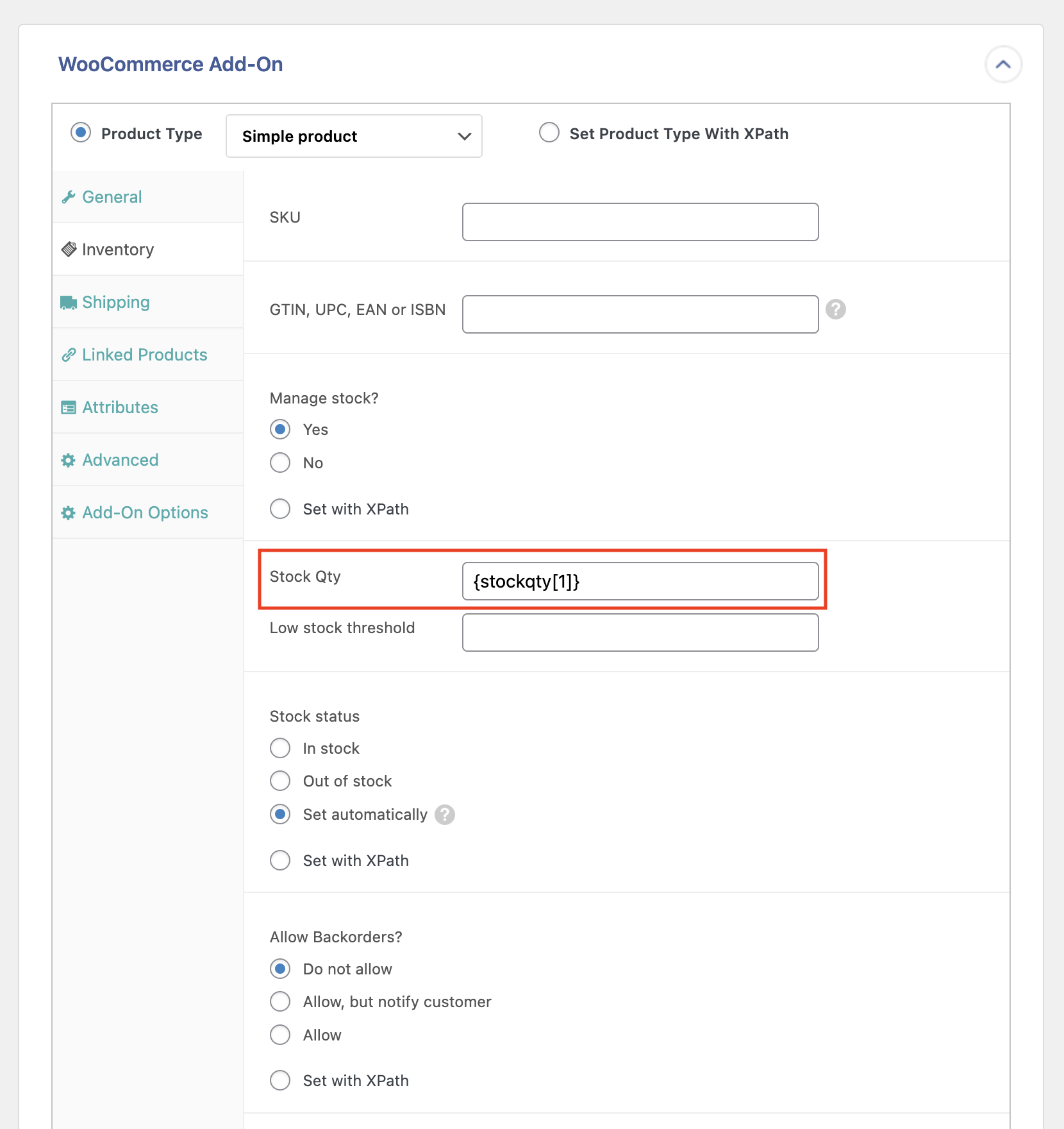 In Step 3, set your Stock Qty in the Inventory tab of the WooCommerce Add-On. You can leave all other settings and sections of Step 3 with their default values.