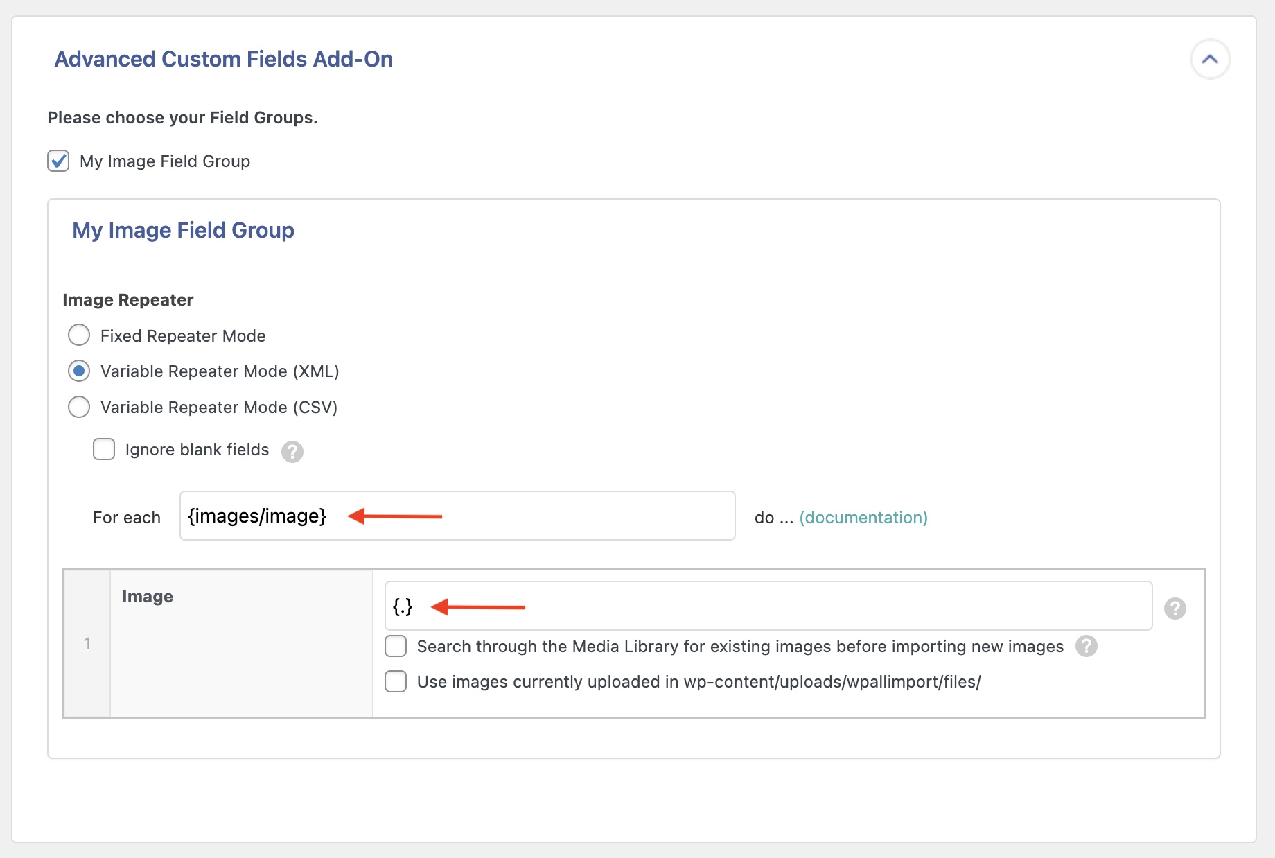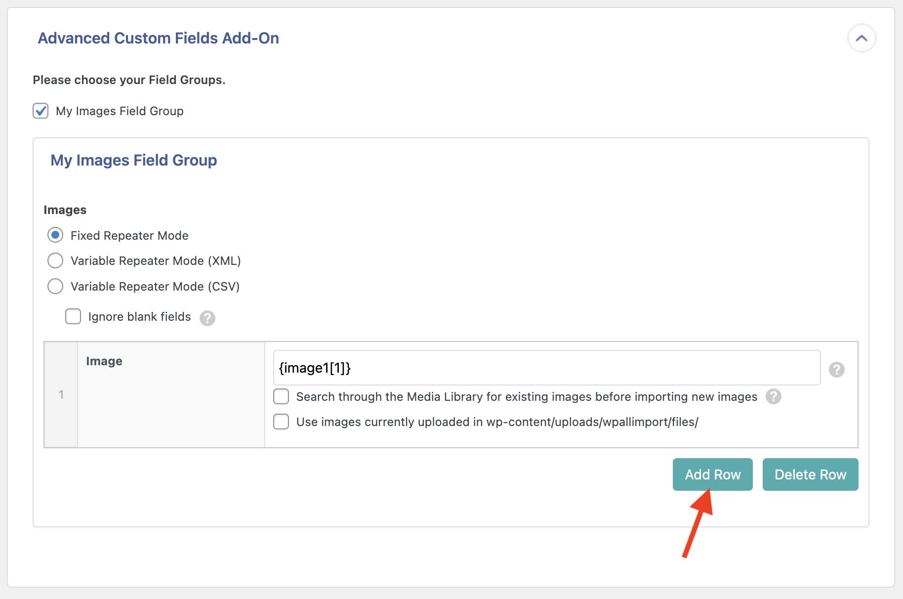 Check the Ignore blank fields box if some of the records in your file don’t contain values for all five images. For example, if image_3 and onwards are blank for a certain record, WP All Import will only add two rows to the repeater for that record.