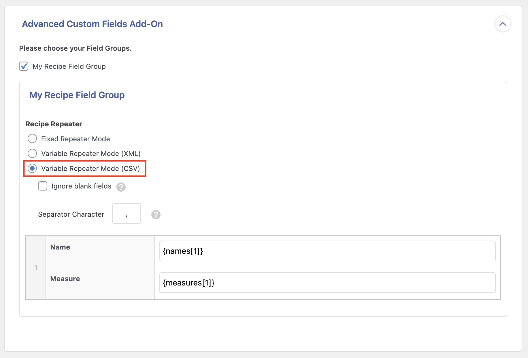 For example, if you have an ACF repeater field containing ingredients (Name and Measure – i.e., 1/2 cup is the measure and butter is the name), and the names & measures are stored in separate columns in your CSV file: